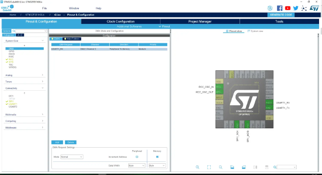 串口相关的部分只要打开串口的全局中断即可,着重于DMA配置,首先Add一个DMA Request为USART1_RX, 通道设置为DMA1 Channel 3,方向为外设到内存(本次是串口接收,所以是串口接收寄存器到RAM)优先级为中。